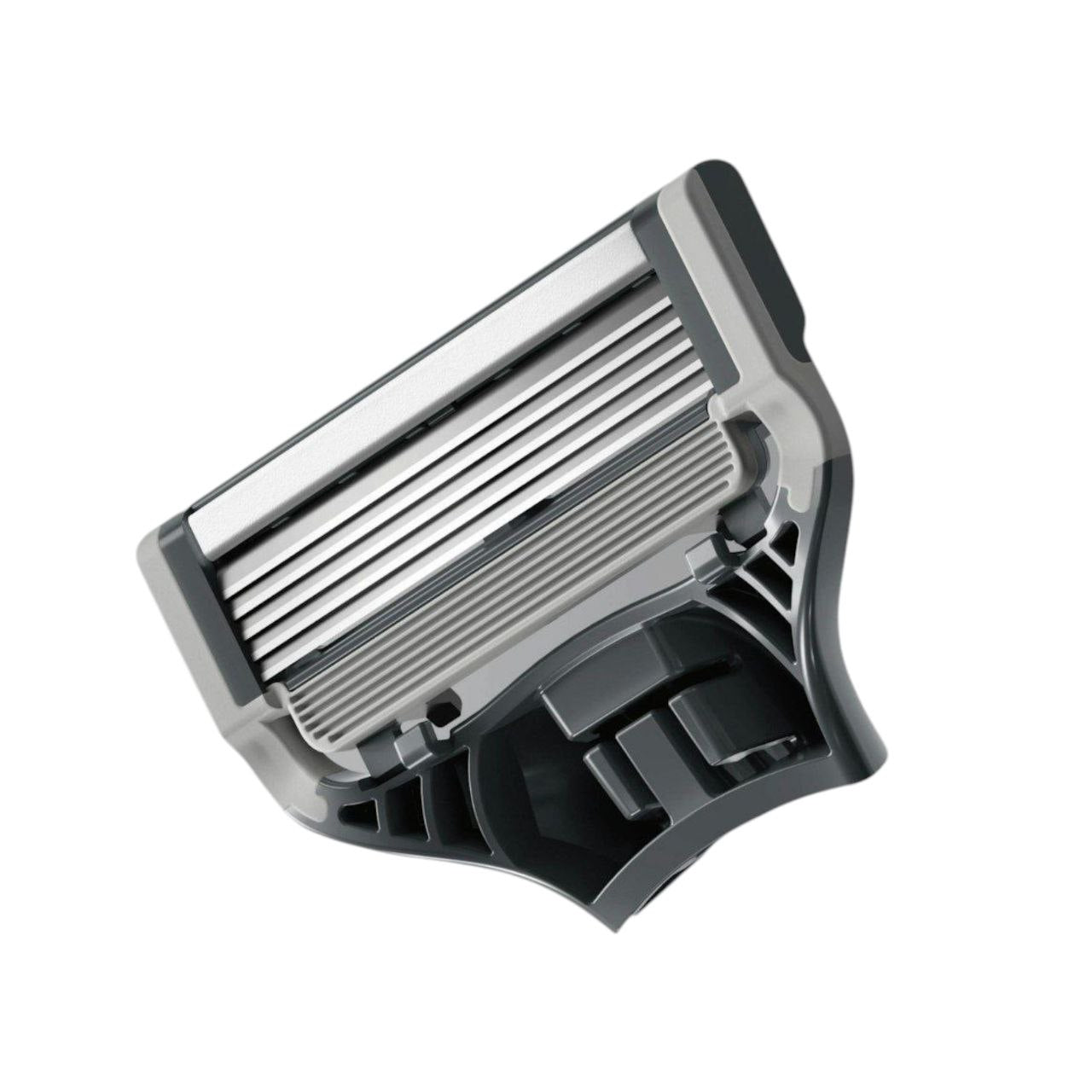 Jede Klinge wird fachmännisch in Deutschland aus hochwertigem schwedischem Edelstahl hergestellt und verfügt über fünf präzise ausgerichtete Klingen für eine gründliche Rasur mit weniger Ziehen und Hautirritationen. Der Gleitstreifen sorgt für ein sanftes Gleiten über die Haut, während das flexible Klingendesign sich den Gesichtskonturen anpasst und so bessere Kontrolle ermöglicht. Ein integrierter Präzisionstrimmer hilft dabei, saubere Konturen an Koteletten, Bartlinien und schwer erreichbaren Stellen zu erhalten.