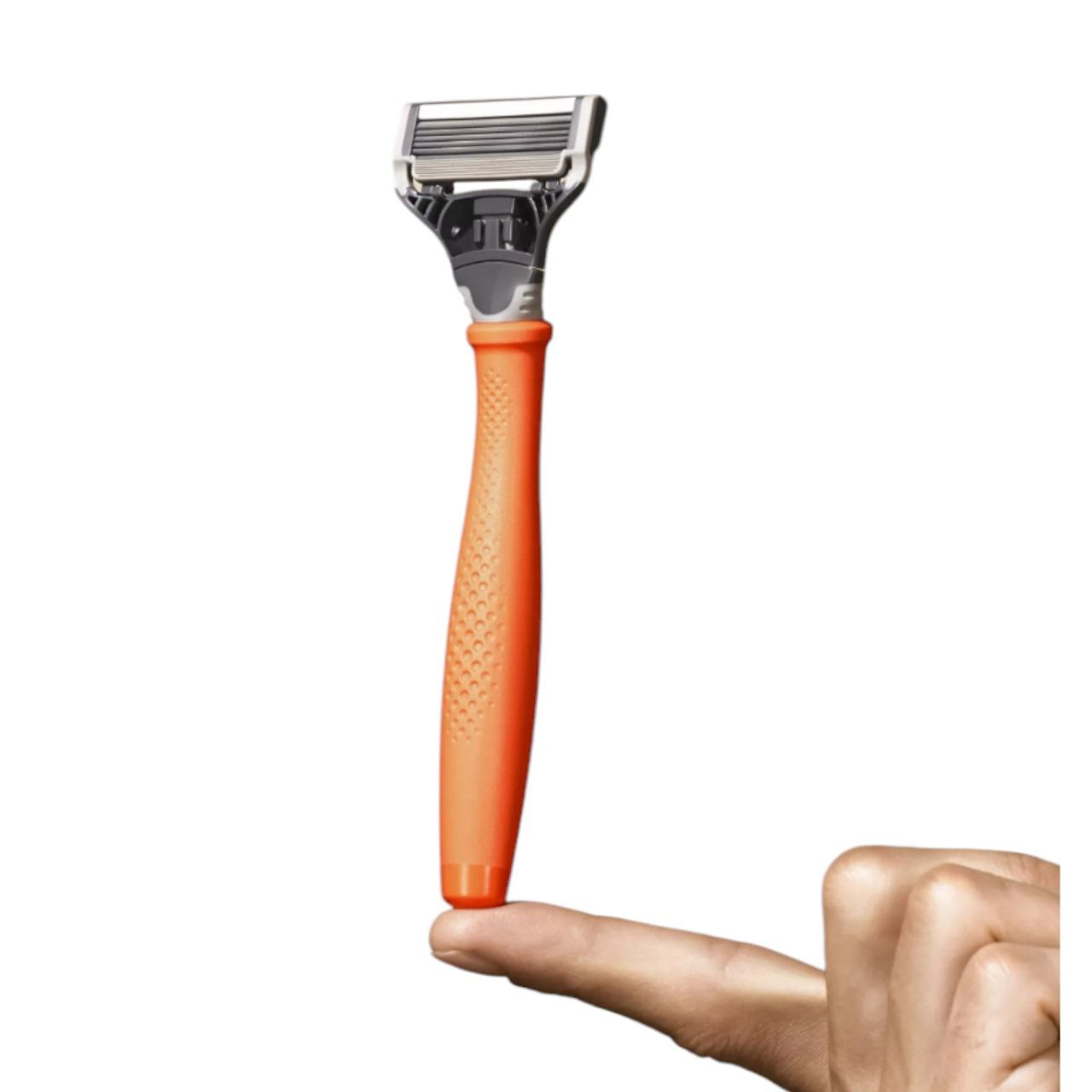 Mango ergonómico de navaja de afeitar de color naranja con agarre antideslizante.